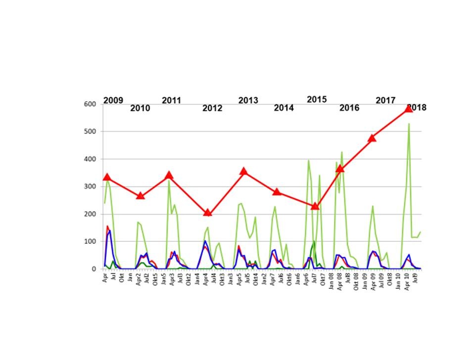 Umso spannender war daher eine auf einem jüngst veröffentlichten Vorhersage-Modell basierende Zeckenprognose, die für das Jahr 2018 eine besonders hohe Zeckenaktivität verhieß. Das Modell war mit Zeckendaten aus den letzten zehn Jahren etabliert worden, die am Institut für Mikrobiologie der Bundeswehr (IMBBw) monatlich erhoben worden waren. Die prognostische Genauigkeit der Modell-basierten Vorhersage für das Jahr 2018 war auch deswegen besonders relevant als 2018 als eines der wärmsten und trockensten Jahre in die Klimageschichte eingehen sollte. Wärme und Trockenheit gelten gemeinhin als Faktoren, die die Aktivität der Zecken verringern, da Ixodes ricinus nur bei einer relativen Luftfeuchtigkeit von <85 % aktiv ist. Daneben stand vor allem die Frage im Raum, welche Auswirkung die Hitze und Trockenheit auf die Zahl der menschlichen FSME-Fälle haben würden.