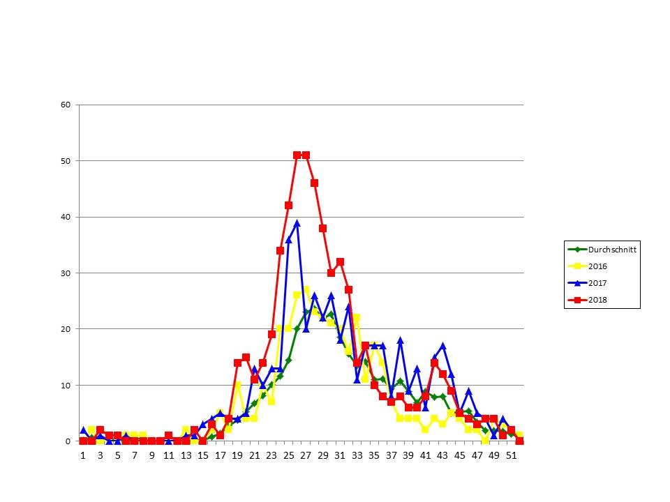 Analysiert man die Zahl der wöchentlichen Meldungen der menschlichen FSME-Fälle im Jahr 2017, so ist zu erkennen, dass die hohen Erkrankungszahlen durch zwei Ereignisse bedingt waren: eine hohe Zahl gemeldeter Fälle in der 25. und 26. Kalenderwoche und eine hohe Zahl gemeldeter Fälle im Herbst (ab ca. der 35. Kalenderwoche) (Abb. 3). Die ursprüngliche Annahme, dass es sich um ein Ferien-bedingtes Phänomen handele, konnte eindeutig widerlegt werden. Die Spitze im Juni 2017 lässt sich durch eine Wetteranomalie erklären (längere kalte Periode im April und Anfang Mai, gefolgt von einer nach plötzlichem Temperaturumschwung sehr warmen Periode ab Mitte Mai), die dazu führte, dass sich ab Mitte Mai die Menschen verstärkt in der Natur aufhielten. Zur gleichen Zeit, Mitte bis Ende Mai, war die höchste Zeckenaktivität des Jahres zu verzeichnen, sodass trotz der insgesamt geringen Zeckenzahlen eine hohe Erkrankungsinzidenz auftrat. Die hohen Zahlen im Herbst waren durch eine intensive Pilzsaison insbesondere in Bayern geprägt, die ebenfalls zu sehr hohen Erkrankungszahlen im September und Oktober und bis in den Beginn des Dezembers hinein führte.