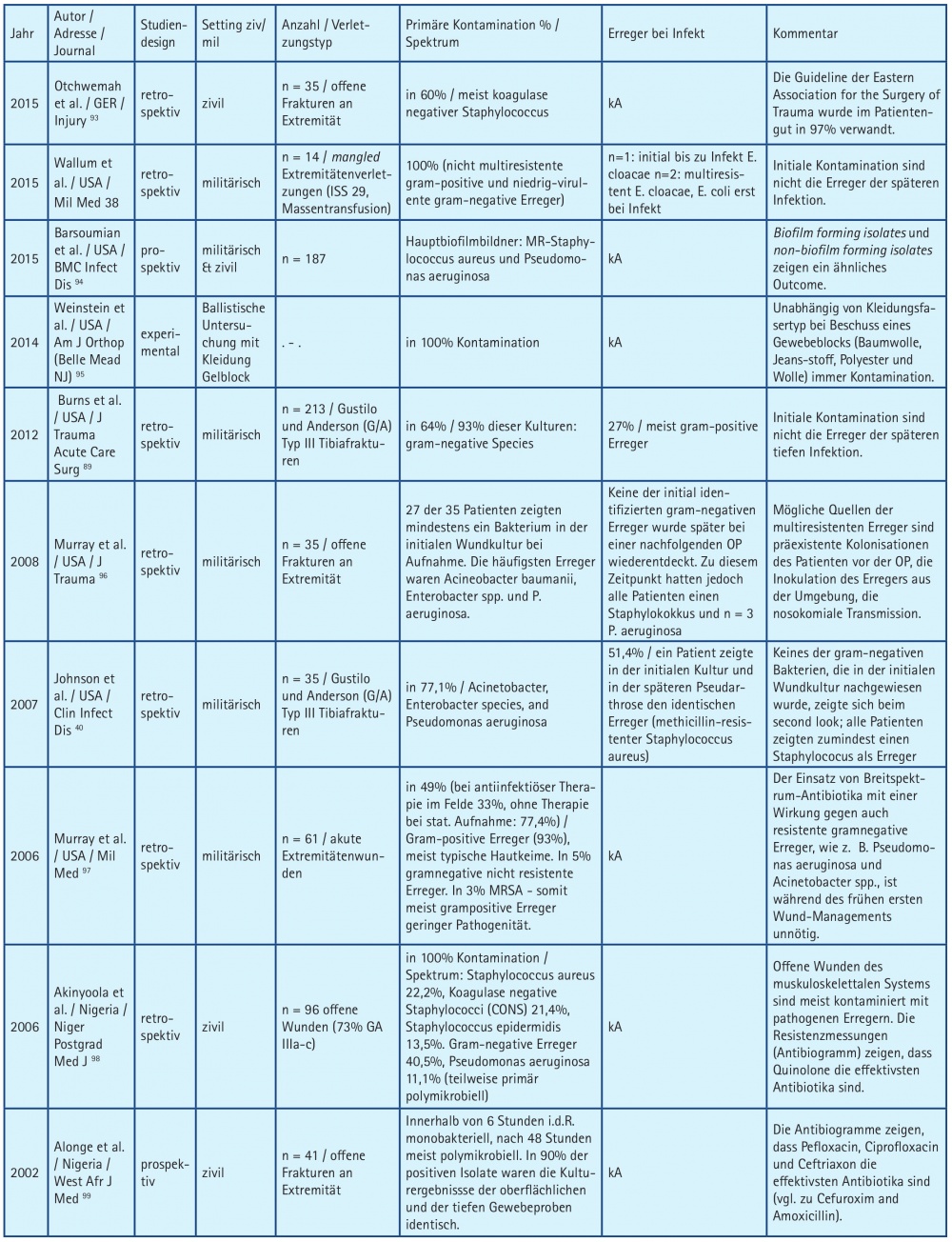 Ein wichtiger Schritt ist hierbei die frühzeitige systemische antimikrobielle Prophylaxe 37. Die Studienlage präsentiert zu den Analysen der relevanten Erreger divergierende Ergebnisse aus unterschiedlich validen Untersuchungen. Die Aussagenspannweite reicht von „... untere Extremitätenverletzungen zeigen hohe Kontaminationsrate mit Umweltkeimen, die nicht mit Infektionen assoziiert sind38 über „ … Kontaminationsrate weniger als 10 % …39 bis hin zu „… gefechtsassoziierte Typ III-Tibiafrakturen sind vor allem mit Gramnegativ-Infektionen assoziiert …“40 (siehe auch Tabelle 2). Daraus resultieren uneinheitliche Ergebnisse zu Art und Dauer des Einsatzes antimikrobieller Substanzen. Auch die Empfehlungen von Fachgesellschaften, insbesondere die EAST Practice Management Guidelines for Prophylactic Antibiotic Use in Open Fractures aus dem Jahr 2000, aktualisiert und kommentiert 2011, werden kontrovers diskutiert41. Folgende Empfehlungen hinsichtlich der mikrobiologischen Diagnostik und des Einsatzes antimikrobieller Substanzen haben sich nach Auffassung der Autoren jedoch bewährt: