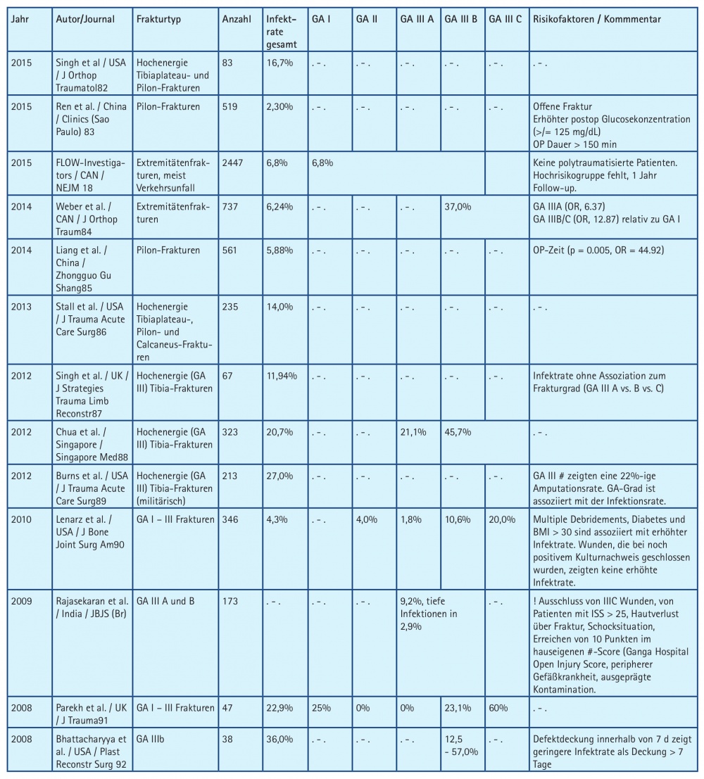Selbst unter idealen Rettungsbedingungen wie z. B. einer optimal frühen Oxygenierung, frühen Gabe potenter Antibiotika, bei Einsatz moderner OP-Verfahren und Implantaten sowie ausgereifter intensivmedizinischer Betreuung besteht auch heute noch ein sehr hohes Risiko für tiefe Infektionen beim hochgradigen Extremitätentrauma. Die aktuelle Analyse zeigt Infektionsraten von bis zu 60 % (siehe Tabelle 1). So ist es naheliegend zu fordern, alle Maßnahmen zu ergreifen, um die Infektionsrate zu reduzieren.