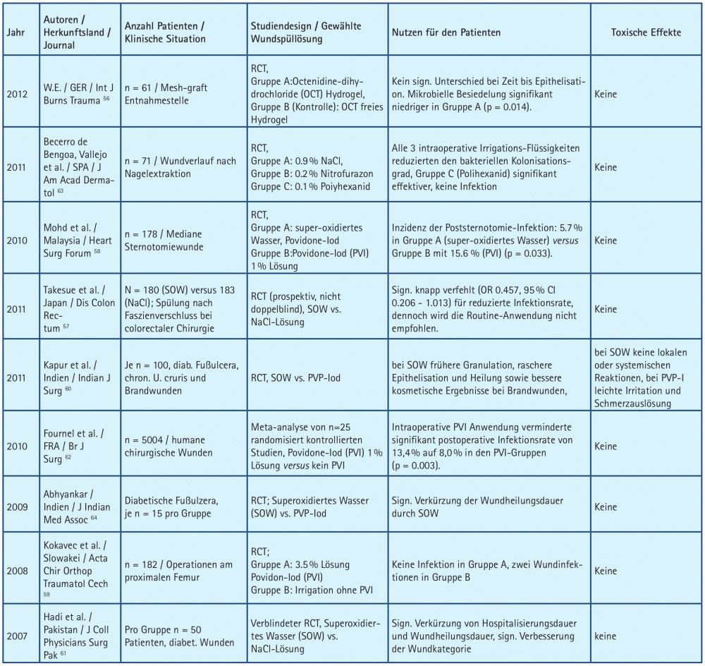 Ergänzend zu den in vitro Untersuchungen wurden, wenn man die Literatur der letzten zwei Dekaden analysiert, in klinischen Anwendungen im Rahmen randomisiert kontrollierter Studien die prophylaktische Wirkung von antiseptisch wirkenden Wundspüllösungen untersucht. In der Gesamtsicht lassen die vorliegenden Untersuchungen in ihrer Gesamtheit keinen Zweifel daran, dass antiseptische Wundspüllösungen die Infektionsrate im Vergleich zu Spülung mit Ringer- oder Kochsalzlösung reduzieren können56-64 (siehe Tabelle 3). Dabei ist sowohl für Polihexanid als auch für superoxidiertes Wasser keine Wundheilungshemmung zu befürchten. So können die teilweise bestehenden Empfeh­lungen vor allem US-amerikanischer Kolle­gen65,66, nur mit Kochsalzlösungen (und wenn nicht vorhanden: mit Leitungswasser) zu spülen und keine Antiseptika aufgrund ihrer gewebetoxischen Nebenwirkung zu verwenden, nicht übernommen werden. Vor dem Hintergrund des heutigen Erkenntnisstandes bestehen folgende prophylaktische Anwendungsmöglichkeiten für antibakteriell wirkende Spülflüssigkeiten bei schweren und kontaminierten Extremitäten-verletzungen67-69: