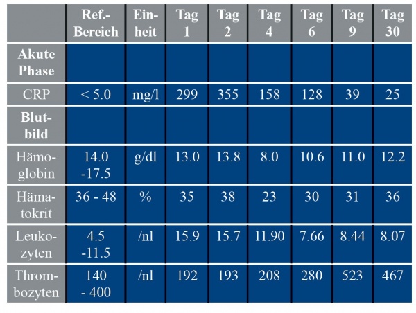 Es erfolgte die stationäre Aufnahme auf die internistische Station mit der Verdachtsdiagnose eines mittelgradigen Haut- / Weichteilinfekts bei Thrombophlebitis. Eine kalkulierte antimikrobielle Therapie mit Ampicillin/Sulbactam (Unacid®) 3 g i. v. 1-1-1 wurde noch in der Notaufnahme begonnen. Unter dieser sowie supportiver Therapie mit antiseptischen, kühlenden Umschlägen und Hochlagerung der Extremität kam es zunächst zu keiner wesentlichen Änderung des Lokalbefundes. Die Entzündungsparameter zeigten sich jedoch rückläufig (Tabelle 1).
