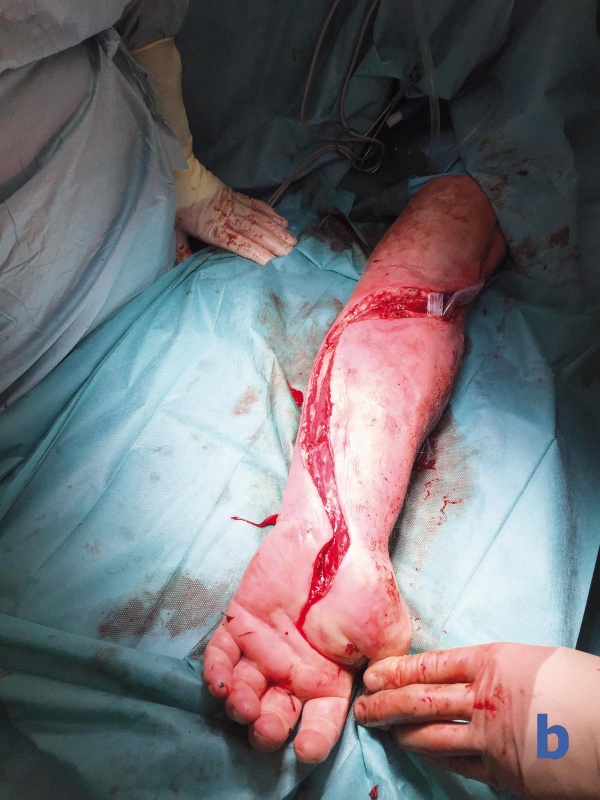 Unstrittig stellt die operative Sanierung des Infektionsfokus die kausale und damit entscheidende Therapie dar. Da zum Zeitpunkt der Operation bereits ein manifestes Kompartmentsyndrom vorlag, war die ausgedehnte Spaltung der Kompartimente der einzig richtige Schritt, um irreversiblen Schaden abzuwenden.