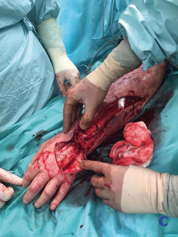 In der unmittelbar durchgeführten Operation zeigte sich eine ausgedehnte Abszedierung, die von der ehemaligen Einstichstelle der Venenverweilkanüle ausging. Es erfolgte die Spaltung der ventralen und dorsalen Kompartimente des Unter- und Oberarmes. Aufgrund des Ausfalls der Funktion des N. Medianus erfolgte in der gleichen Sitzung die Spaltung des Karpaltunnels durch den Neurochirurgen. Der mit nekrotischer Haut bedeckte kubitale Abszess wurde exzidiert, alle erkennbaren septischen Metastasen wurden radikal exzidiert.
