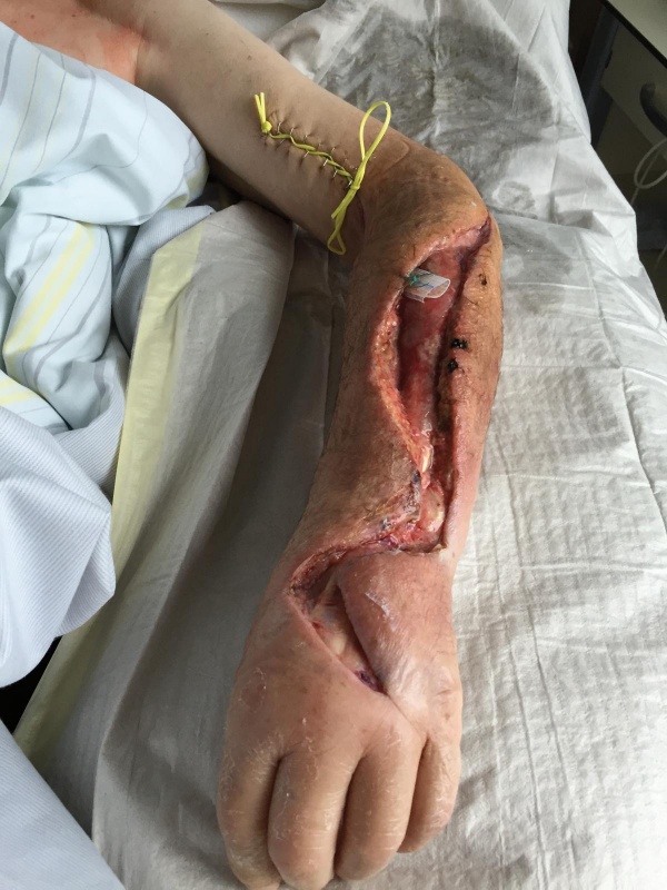 Postoperativ wurde die bereits begonnene Therapie mit Ampicillin/Sulbactam zunächst weitergeführt. Unter der Wundtherapie mit täglichen Verbandswechseln mittels Polyhexanid 0,02 %-Feuchtverbänden zeigte sich der Lokalbefund zügig regredient. Aufgrund der ausgeprägten Schmerzsymptomatik wurden die Verbandwechsel zunächst im Operationssaal unter Vollnarkose durchgeführt. Bei zunehmend blanden Wundverhältnissen begannen wir am 10. postoperativen Tag eine Dermotraktionsbehandlung. Am 19. postoperativen Tag erfolgte der Sekundärverschluss sowie im Bereich der Abszessexzision cubital eine Spalthauttransplantation (Entnahme am Oberschenkel).