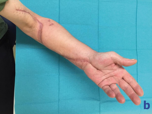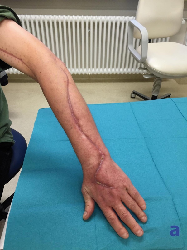 Nach Entlassung nahm der Patient mehrfach die angebotene poststationäre Beurteilung durch unsere Abteilung wahr. Hier zeigte sich ein komplikationsloser Verlauf mit guter Wundheilung. Beim letzten postoperativen Vorstellungstermin (57 Tage nach Operation) war nahezu eine Restitutio ad integrum zu verzeichnen: Eine normale Funktion von Arm und Hand ohne Probleme bei Bewältigung des Alltags war wieder gegeben; nur eine minimale, am ehesten narbenbedingte Bewegungseinschränkung der Hand wurde noch beklagt. Weiterhin persistierte noch eine Taubheit im Bereich einer circa 10 x 5 cm großen Stelle um medialen Unterarm.