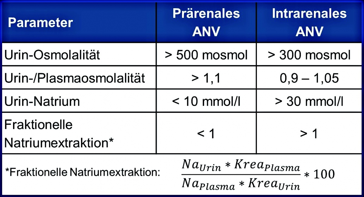 Eine Differenzierung zwischen prärenalem und intrarenalem ANV ist u.a. laborchemisch möglich (Tabelle 2) .
