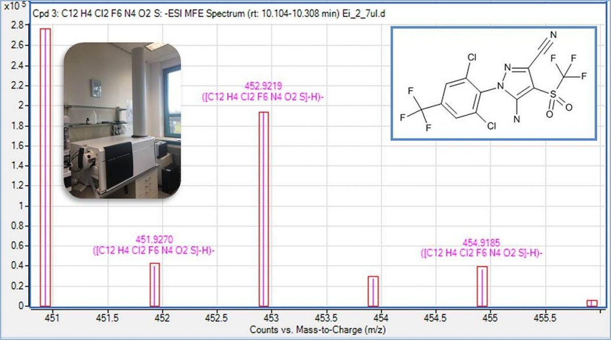 In den letzten Jahren hat sich dabei die als „Non-Target-Analytik“ bezeichnete Methode als ein zielführender Ansatz erwiesen [1]. Durch die Kombination der Gaschromatographie bzw. der Flüssigchromatographie mit der hochauflösenden Massenspektrometrie und einer gezielten Datenbankauswertung, gelingt es, trotz fehlender Vergleichsstandards „unbekannte Substanzen“ zu identifizieren. Diese Technik wurde in der Lebensmittelanalytik am Zentralen Institut des Sanitätsdienstes der Bundeswehr (ZInstSanBw) München erfolgreich zur Untersuchung von Eiern im Rahmen der Fipronilkrise eingesetzt [2]. Abbildung 1 zeigt das Isotopenmuster eines hochaufgelösten Massenspek-trums von Fipronil, das zur eindeutigen Identifikation des Biozids führte. Die Technik wird derzeit vor allem in der Rück-standsanalytik eingesetzt, um nicht erlaubte bzw. nicht vermutete Rückstände in Lebensmitteln nachzuweisen, ist aber auch in der Analytik humaner Proben zum Nachweis von Designer-drogen unerlässlich [3].
