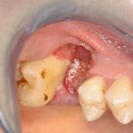 Patient 43 Jahre, männlich, Nichtraucher mit unauffälliger Allgemeinanamnese stellte sich am 20.01.2006 erstmalig zur Routineuntersuchung vor. Diese ergab neben einem Gesamtsanierungsbedarf unter anderem auch die Nichterhaltungswürdigkeit des Brückenpfeilers 45. Nach intensiver Aufklärung über Therapieoptionen und Erstellen eines Behandlungsplanes, erfolgte nach zwei Initialsitzungen zur Mundhygienemotivation zunächst die konservierende und parodontologische Vorbehandlung. Am 09.10.2006 wurden die Zähne 18, 45 und 48 in Lokalanästhesie entfernt. Der Operationssitus offenbarte eine knöcherne Dehiszenz des Zahnes 45 bis zum Apex und einen in vestibulo-oraler Richtung stark atrophierten Kieferkamm regio 46.