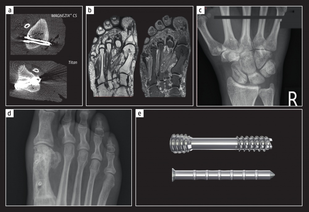 Klinisch wurden bislang in fast allen Fällen (weit über 7 000) positive Resultate erzielt. Umfangreiche Vigilanzdaten zeigen in nahezu allen Fällen eine regelhafte knöcherne Ausheilung der nach Osteotomie oder Fraktur verschraubten Knochen. Bisherige Schwierigkeiten im Umgang mit dem Implantat oder unerwünschte klinische Ergebnisse waren vorwiegend auf eine unscharfe Indikationsstellung oder eine mangelhafte OP-Technik zurückzuführen (Seitz et al., 2015). In manchen Fällen treten im Röntgenbild mehr oder minder stark ausgeprägte Aufhellungszonen um das Implantat herum auf. Dieses Phänomen ist dem Abbau der Implantate durch Degradation geschuldet (Knochenumbauzone). Die MRT-Befunde nach drei Jahren Follow up zeigen eindeutig den Umbau der Schraube in kortikalis-ähnliches, körpereigenes Knochengewebe (Abb. 1b). Auch wenn die klassische Herbert-Schraube ihre primäre Indikation bei der Skaphoid-Fraktur hat (Abb. 1c), so ist das weltweit erste metallische bioabsorbierbare Implantat, die MAGNEZIX® Compression Screw (CS), bereits in den verschiedensten Körperregionen eingesetzt worden, u.a. bei den folgenden Indikationen: Hallux valgus (Abb. 1d), Klaviculafraktur, proximale Radiusfraktur (Radiusköpfchen), Unterarmfraktur, distale Radiusfraktur, Metakarpalefrakturen, Azetabulumfrakturen, Hüftkopffrakturen (Pipken), distale Femurfraktur, Patellafrakturen, Innen- und Außenknöchelfrakturen u. a. m.