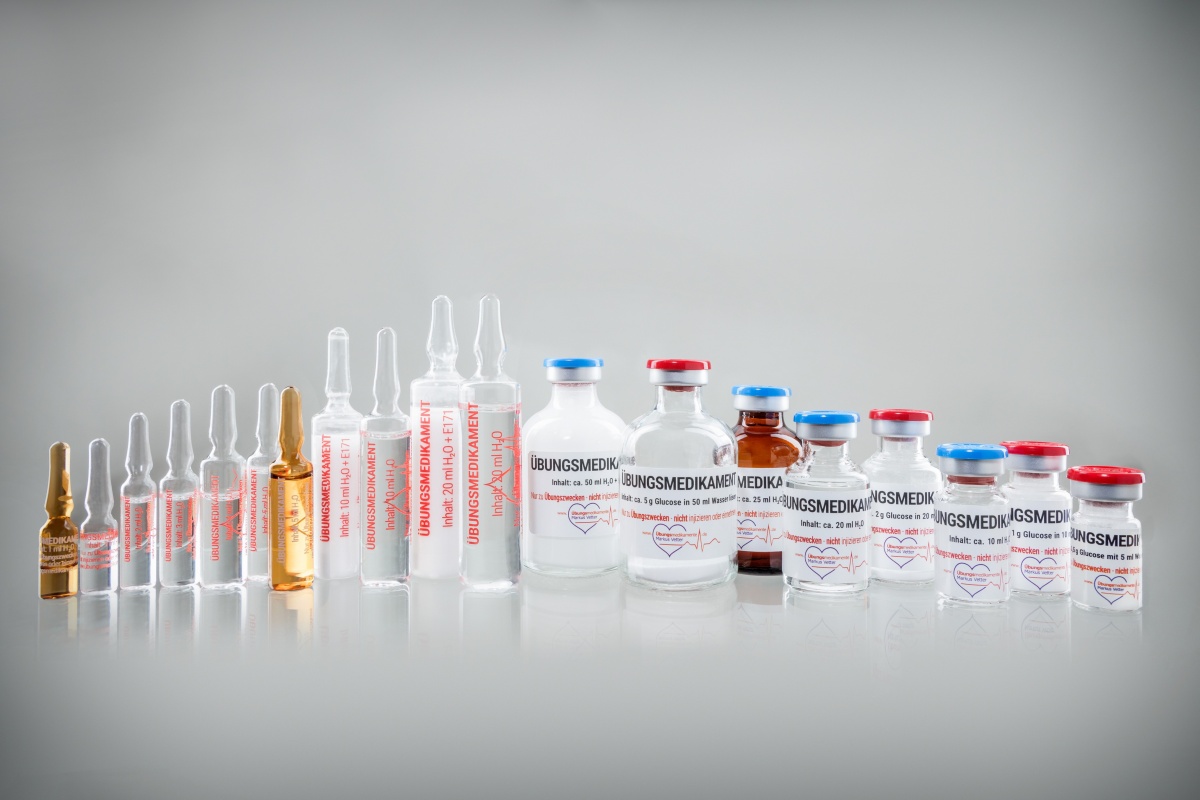 Um den Einsatz von Medikamenten gesetzes- und vorschriftenkonform, sowie realitätsnah und kostengünstig darstellen zu können, wird auf dezentral beschaffte Übungsmedikamente zurückgegriffen. Diese sind deutlich als solche gekennzeichnet und mit Wasser, Glukosepulver oder Farbstoff befüllt und in den gängigsten Größen verfügbar. Mit selbst erstellten Aufklebern für die verschiedenen Medikamente werden so realistische Bilder für die Ausbildung geschaffen.