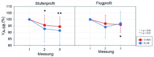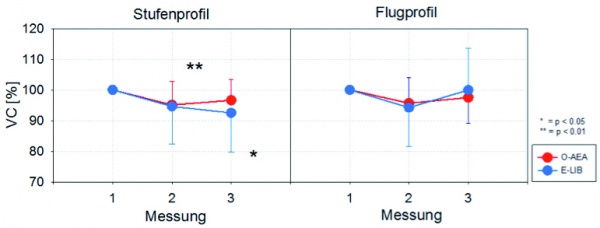 Sowohl unmittelbar nach dem Stufenprofil als auch nach dem Flugprofil kam es im Vergleich zur Ausgangslage zu deutlichen Störungen der Ventilation mit signifikanten Abnahmen aller Ventilationsgrößen (TLC, VC, RV, VA). Da dieses Phänomen bei beiden Anti-G-Anzügen gleichermaßen aufgetreten ist, muss es als Folge der Beschleunigungsbelastung gewertet Im Hinblick auf Änderungen der Vitalkapazität sind ähnliche Befunde bereits von anderen Autoren erhoben worden [11], die Veränderungen der Totalen Lungenkapazität, des Residualvolumens und der alveolären Ventilation nach G-Beschleunigungen sind nach Kenntnis der Autoren dagegen erstmalig beschrieben worden.