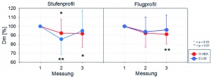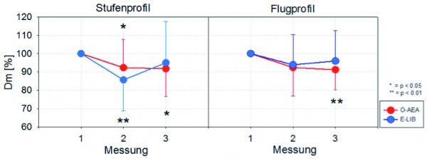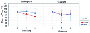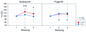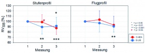 Bei den in den Abbildungen 6 bis 14 aufgeführten Messungen gibt die Messung eins jeweils den in der Ausgangslage, das heißt vor Absolvieren der Belastungsprofile erhobenen Bezugswert wieder, während die Messungen zwei und drei die Ergebnisse der beiden unmittelbar aufeinanderfolgenden Messungen nach der Zentrifugenbelastung repräsentieren.