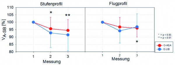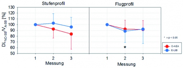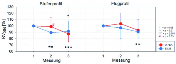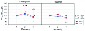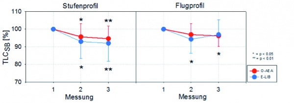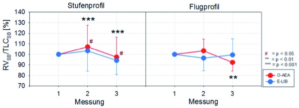 Hinweise auf Unterschiede zwischen beiden Systemen fanden sich vor allem hinsichtlich des prozentualen Anteils des Residualvolumens an der totalen Lungenkapazität (RVSB/TLCSB), wie Abbildung 14 zeigt. Hier scheint der im Vergleich zu E-LIB höhere RVSB/TLCSB-Quotient beim O-AEA insbesondere nach dem Stufenprofil auf eine Behinderung der Atmung durch die Bauchblase der Anti-G-Hose hinzudeuten, welche die Dehnbarkeit der Lunge beziehungsweise einzelner Abschnitte einschränkt und die Luftverteilung stört.