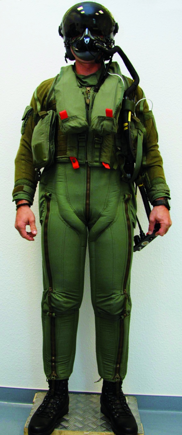 Das Einsatzspektrum des EUROFIGHTER als strahlgetriebenes Hochleistungskampfflugzeug der vierten Generation stellt hohe Anforderungen an die Piloten. Dabei sind in physiologischer Hinsicht besonders die Belastungen aufgrund der Einwirkung hoher Beschleunigungskräfte extrem und ohne ein leistungsfähiges Anti-G-Schutzsystem nicht zu bewältigen. Diese Systeme sollen der durch die positive Gz-Belastung[2] bedingten Verschiebung von Blutvolumen in die abhängigen, tieferliegenden Körperregionen entgegenwirken und den intrathorakalen Druck erhöhen, um so auch unter der Beschleunigungsbelastung eine hinreichende (suffiziente) Perfusion des Gehirns zu ermöglichen. Um dies zu erreichen, wird in der Bein- und Bauchregion mit zunehmender Gz-Belastung von außen ein wachsender Gegendruck auf den Körper aufgebracht. Verwirklicht wird dies üblicherweise durch den Einsatz von pneumatischen Systemen. Allerdings gibt es auch Systeme, die den Gegendruck beschleunigungsabhängig über hydrostatische Säulen erzeugen.