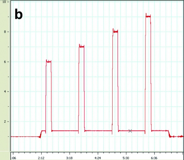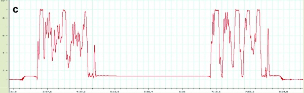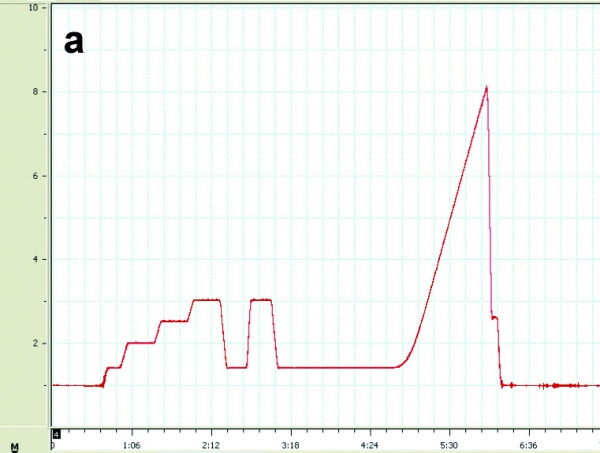 Beim ersten Wertungsprofil handelte es sich um einen Eingewöhnungslauf mit anschließendem Linearprofil (Abbildung 3a). Es war das einzige passiv gefahrene Profil[3]. Das Linearprofil diente dabei der Bestimmung der sogenannten „relaxed G-Toleranz“, also dem Gz-Wert, der in entspanntem Zustand mit Schutzanzug, aber ohne vom Piloten ausgeführtes Anti-G-Manöver erreicht wird. Als Endpunkt des Profils wurde der Verlust des peripheren Sehens gewertet. Dieser wurde verifiziert, indem der Pilot Lichtsignale, die ihm in der Zentrifugengondel im Bereich des peripheren Gesichtsfeldes eingespielt wurde, mit einem Knopfdruck beantworten musste. Blieb diese Antwortreaktion aus, wurde die Zentrifugenfahrt beendet. Die beiden anderen Profile (Stufenprofil und Flugprofil) wurden aktiv beziehungsweise interaktiv mit einer Onset Rate[4] von 6 Gz/s absolviert. Beim Stufenprofil steuerte der Proband die HZF zunächst auf ein G-Plateau von 6 Gz, auf dem er für 10 s verweilte. Danach wurde wieder auf „Baseline“ (1,4 Gz) gefahren. Nach einer einminütigen Pause erfolgte dann die nächste Gz-Belastung, die jeweils um 1 Gz höher lag, so dass bei diesem Profil stufenweise die Belastungen von 6 Gz bis 9 Gz gesteigert wurden (Abbildung 3b). Beim Flugprofil (Abbildung 3c) war es die Aufgabe des Probanden, nach einer sogenannten G-Awareness-Exercise die HZF aktiv zu steuern und einem Zielflugzeug (MIG 29) zu folgen, dessen Profil eingespielt wurde (sogenanntes interaktives Profil). Auf diese Weise wurden alle Probanden einer weitgehend gleichen Belastung unterzogen. Ein Verfolgungsflug dauerte etwa 60 s und wurde während eines Testlaufs zweimal absolviert. Die Pause zwischen beiden Verfolgungsläufen betrug zwei Min. In dieser Zeit befand sich die HZF auf Baseline (1.4 Gz).