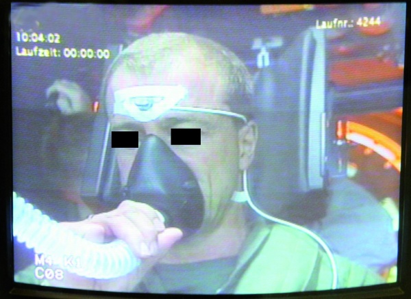 Gerätetechnisch kam ein handelsüblicher, zugelassener Mess-platz (Jaeger MasterScreen PFT Pro® (Cardinal Health Germany 234 GmbH, Höchberg) zum Einsatz. Da dieses Gerät aufgrund seiner Auslegung für den klinischen Alltag ohne Veränderungen nicht für diese Studie geeignet war, mussten wesentliche Anpassungen hinsichtlich der Mobilität des Gerätes, der Flexibilität des Messkopfes sowie der Robustheit des Aufbaues vorgenommen werden, um den Umgebungs- und Einsatzbedingungen im Arbeitsbereich der HZF gerecht zu werden. Dabei durften zulassungsrelevante Größen und insbesondere die Qualität der Messung betreffende Parameter nicht verändert werden. Da bisher kein kommerzielles Gerät bekannt und verfügbar war, das unverändert für die Klärung der Fragestellung in der Humanzentrifuge geeignet gewesen wäre, wurde es so angepasst, dass der Messkopf mit den Sensoren abnehmbar war und in die HZF hineingehoben werden konnte. Die Testgasflaschen wurden auf einem fahrbaren Wagen hinter der Datenerfassungseinheit des Messgerätes montiert. Das Mundstück wurde durch eine Atemmaske ersetzt, mit deren Umgang Piloten aus dem täglichen Flugbetrieb vertraut sind und die das Atemmuster weniger beeinflusst als das üblicherweise bei diesem Gerät benutzte Mundstück. (Abbildungen 5 und 6)