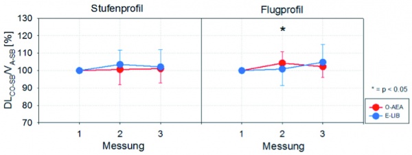 Die Diffusionskapazität für CO – normiert auf das Alveolarvolumen – (DLCO-SB/VA-SB, sogenannter Krogh-Faktor, KCO-SB, Abbildung 10) blieb nach den unterschiedlichen G-Belastungen nahezu unverändert oder stieg leicht an. Im Zusammenhang mit der deutlich reduzierten alveolären Ventilation (Abbildung 9) ist dies ein klares Indiz für einen merklichen Verlust an funktionellem Lungenparenchym („loss of lung units“) in Form von Atelektasebildung durch die vorangegangene Gz-Belastung. Hierbei kommt es zum Kollabieren von Lungenabschnitten durch Aneinanderlegen der Alveolarwände. Je nach Größe der Atelektasen ist die für den Gasaustausch zur Verfügung stehende Oberfläche verringert und damit auch die Sauerstoffaufnahme reduziert. Beim Flugprofil war dieser Verlust bei O-AEA gegenüber der Ausganglage auch statistisch zu sichern. Beide betrachteten Systeme, O-AEA und E-LIB, zeigten dabei ein ähnliches Verhalten.