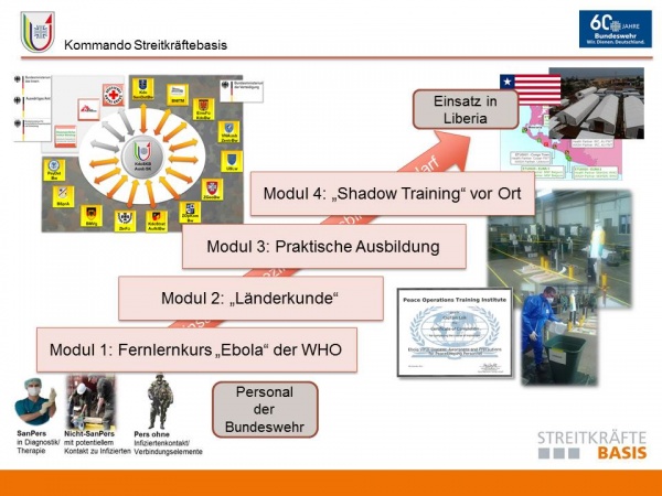 Die fachliche Federführung der Ausbildung lag hierzu, mit Ausnahme sanitätsspezifischer Ausbildungsanteile, beim Kommando Streitkräftebasis (KdoSKB). Zur weiteren Ausplanung und Durchführung der Ausbildung wurden die Organisationsbereiche der Bundeswehr dem KdoSKB auf Zusammenarbeit angewiesen. Auf dieser Grundlage wurde durch KdoSKB, Abteilung Ausbildung Streitkräfte am 8. Oktober 2014 die vorläufige Ausbildungsweisung für den Einsatz deutscher Kräfte zur Unterstützung der Bekämpfung von Ebola durch die Bundeswehr in Westafrika erlassen, die im Dezember 2014 auf Grundlage gemachter Erfahrungen fortgeschrieben und herausgegeben wurde.