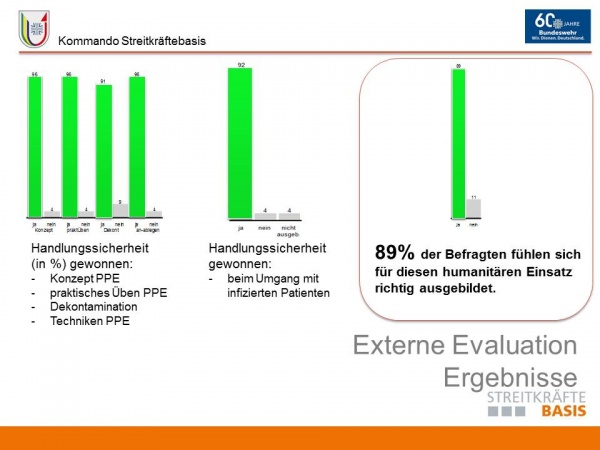 Die im Rahmen der internen und externen Evaluation gewonnenen Erkenntnisse unterstreichen nachhaltig und belastbar den erzielten Ausbildungserfolg. Die für die Bundeswehr bislang einmalige enge Zusammenarbeit in Ausbildungsfragen sowohl mit dem Deutschen Roten Kreuz als auch und insbesondere mit Personal der Organisation Ärzte ohne Grenzen e. V. sind hierbei besonders positiv hervorzuheben.