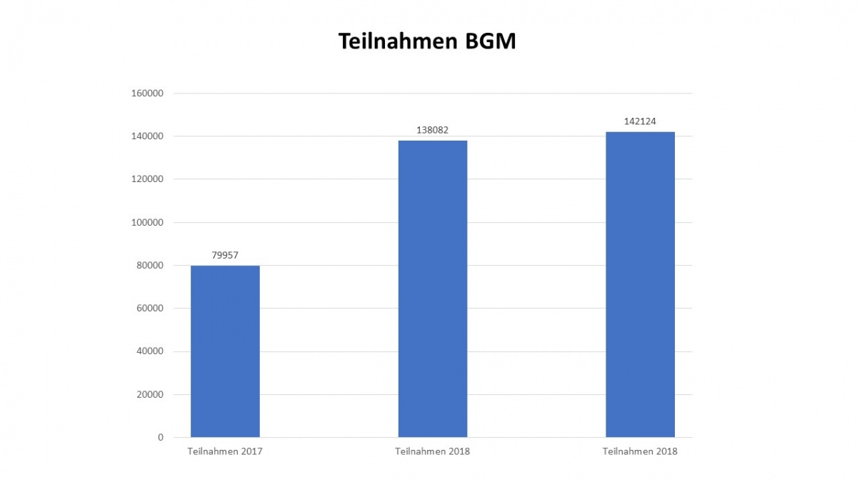 In den Jahren 2016 bis 2019 wurden bundesweit ca. 4800 BGM-Maßnahmen durch qualifizierte interne oder externe Anbietende mit durchschnittlich 12 Teilnehmenden pro BGM-Maßnahme durchgeführt.