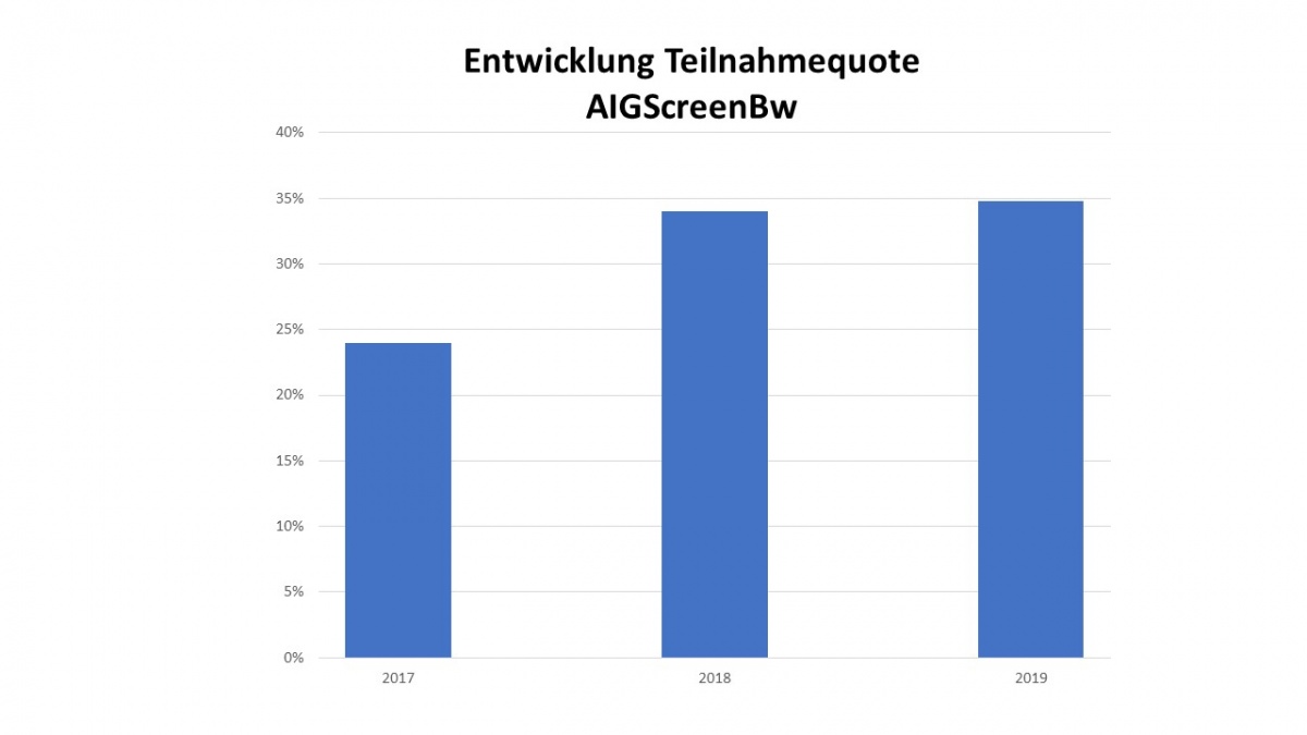 Der AIGScreenBw wurde auch nach der Erprobung konsequent weiterentwickelt und hat zunehmend an Akzeptanz gewonnen. Lag die Teilnehmerzahl an der ersten und zweiten Befragungswelle noch bei lediglich bei 22,4 % bzw. 16,0 %, konnte sich diese Teilnahmequote im Rahmen der bundesweiten BGM-Implementierungsphase, von 2016 bis März 2020 deutlich steigern und stabilisieren. Bereits im Jahr 2018 konnte eine durchschnittliche Teilnahmequote von 33,8 % bei den Befragungen erreicht werden. Insgesamt wurden in diesem Zeitraum 112 Dienststellen erreicht.