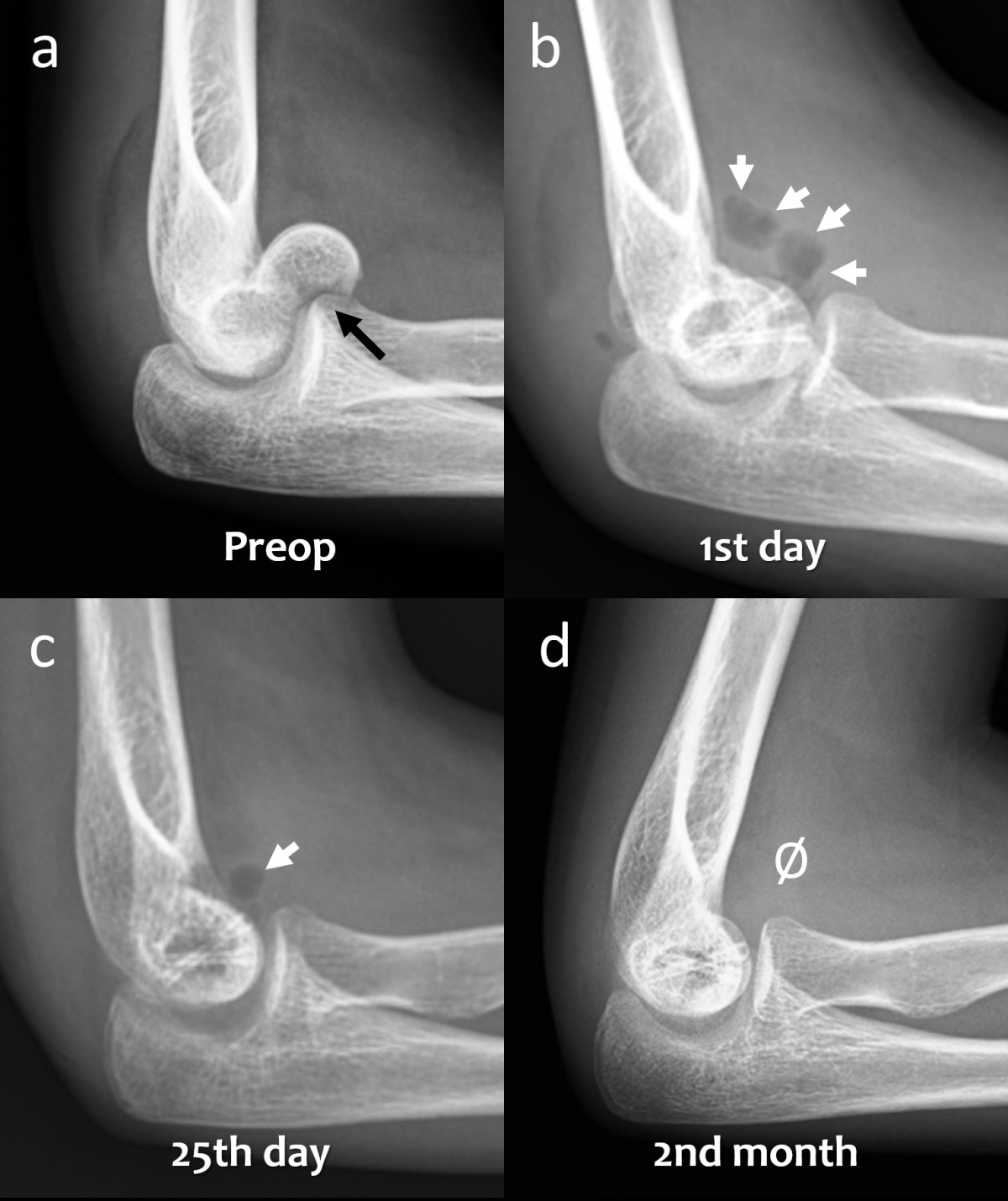 Röntgenaufnahme des Ellenbogens 25 Tage nach der Operation, die