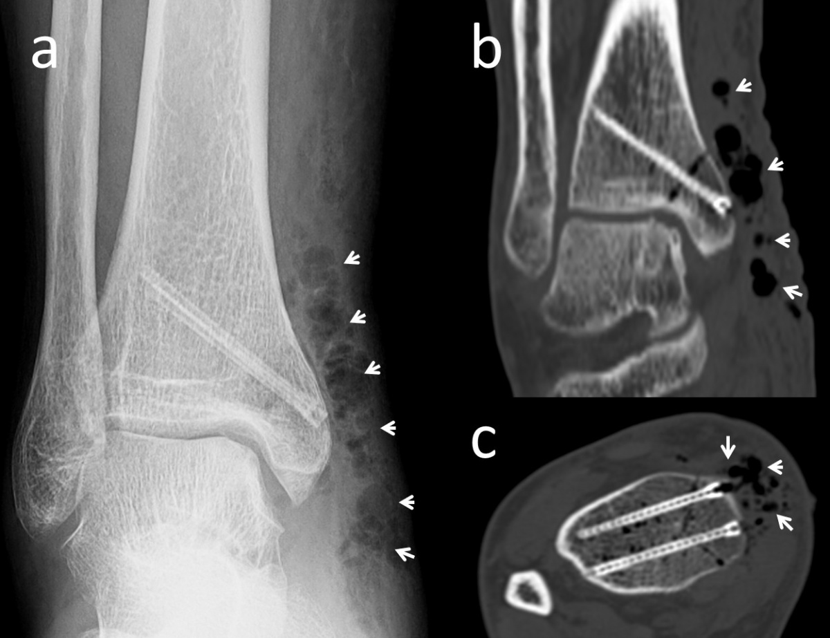im Weichgewebe (weiße Pfeile) am ersten postoperativen Tag. (c)