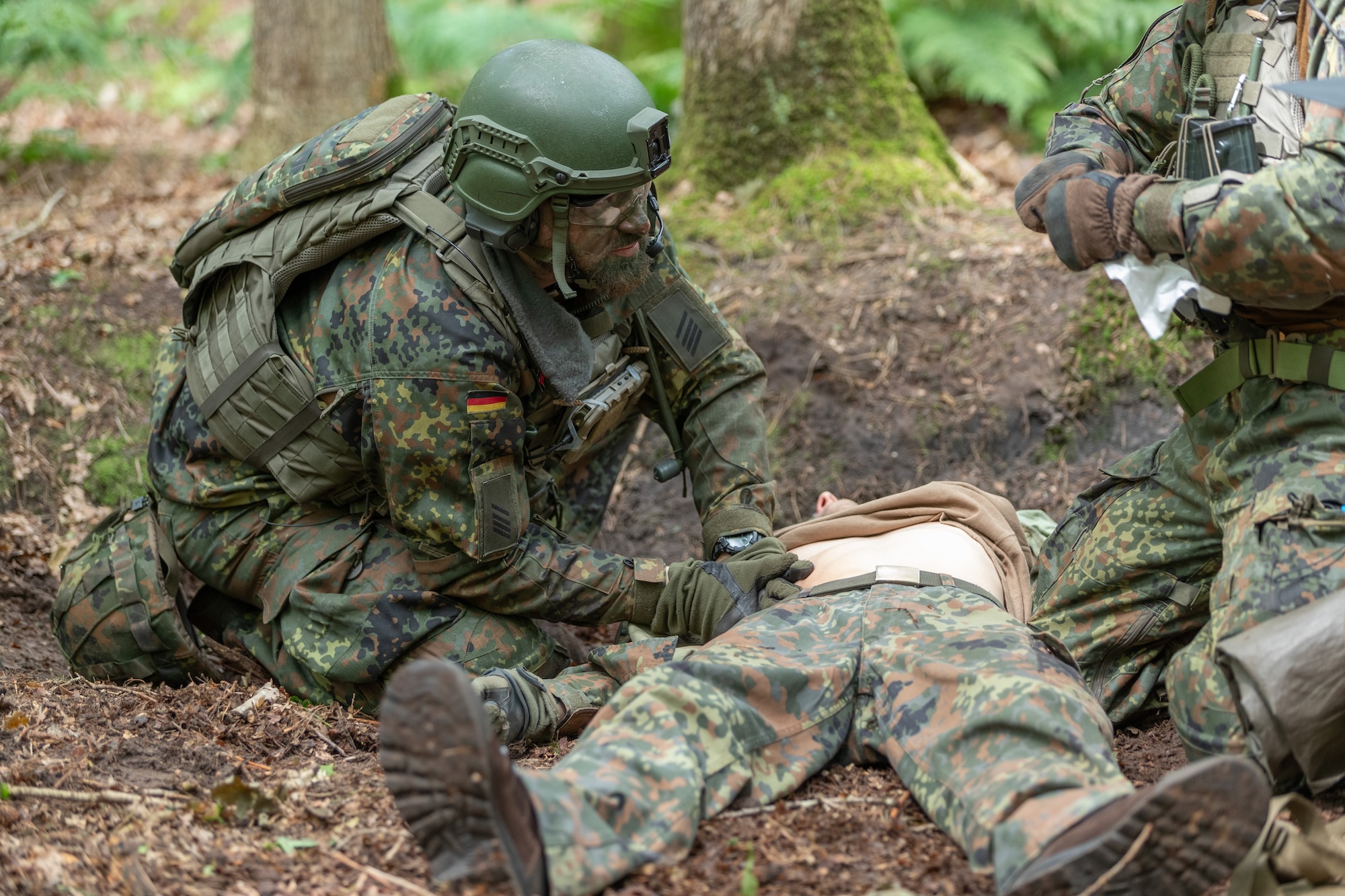 Medical service information training exercise – A soldier providing first aid to a wounded person. Photo: German Armed Forces