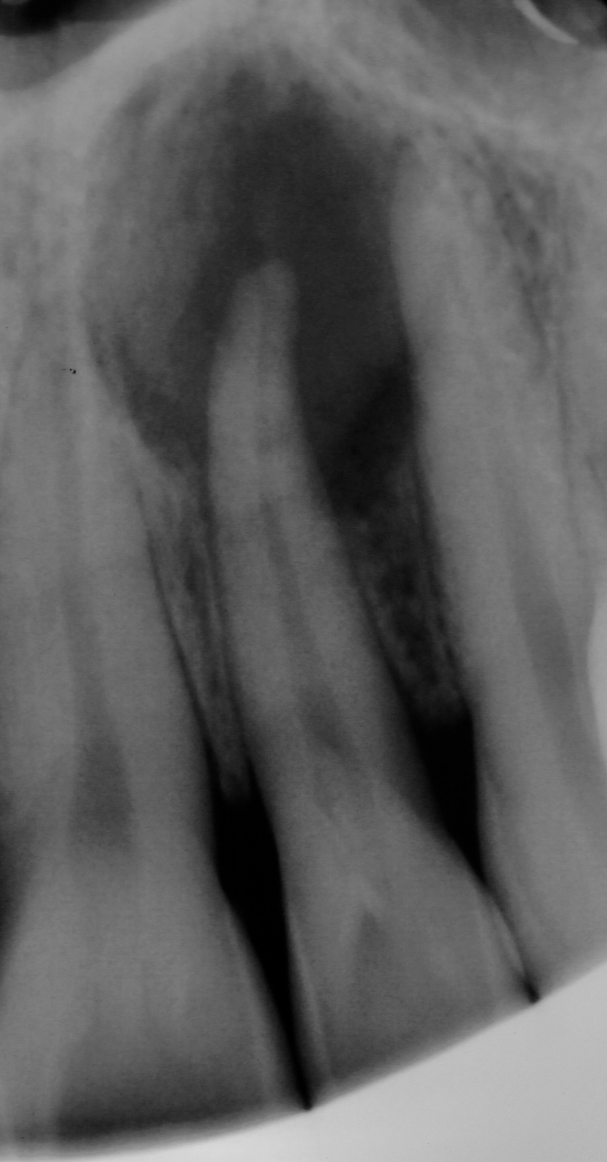 Eine 39-jährige Soldatin stellte sich im Januar 2020 mit Druckbeschwerden Regio 22 in unserer Abteilung vor. Wie auch in der vorangegangenen Falldarstellung konnten die Beschwerden mit Druck auf das Vestibulum verstärkt werden. Der Perkussionstest fiel deutlich positiv, der Vitalitätstest hingegen negativ aus. Eine erhöhte Lockerung des Zahnes lag, trotz des eindrucksvollen Röntgenbefundes, nicht vor. Erste Beschwerden traten laut Aussage der Patientin bereits 2014 auf. Das zu diesem Zeitpunkt angefertigte Röntgenbild zeigte keinen signifikanten pathologischen Befund, woraufhin die Situation weiterhin beobachtet wurde. Das aktuell angefertigte Röntgenbild zeigte eine umfangreiche periapikale Osteolyse, welche sich bis zu den Wurzelspitzen 21 und 23 erstreckte. Der Vitalitätstest der beiden benachbarten Zähne fiel positiv aus.