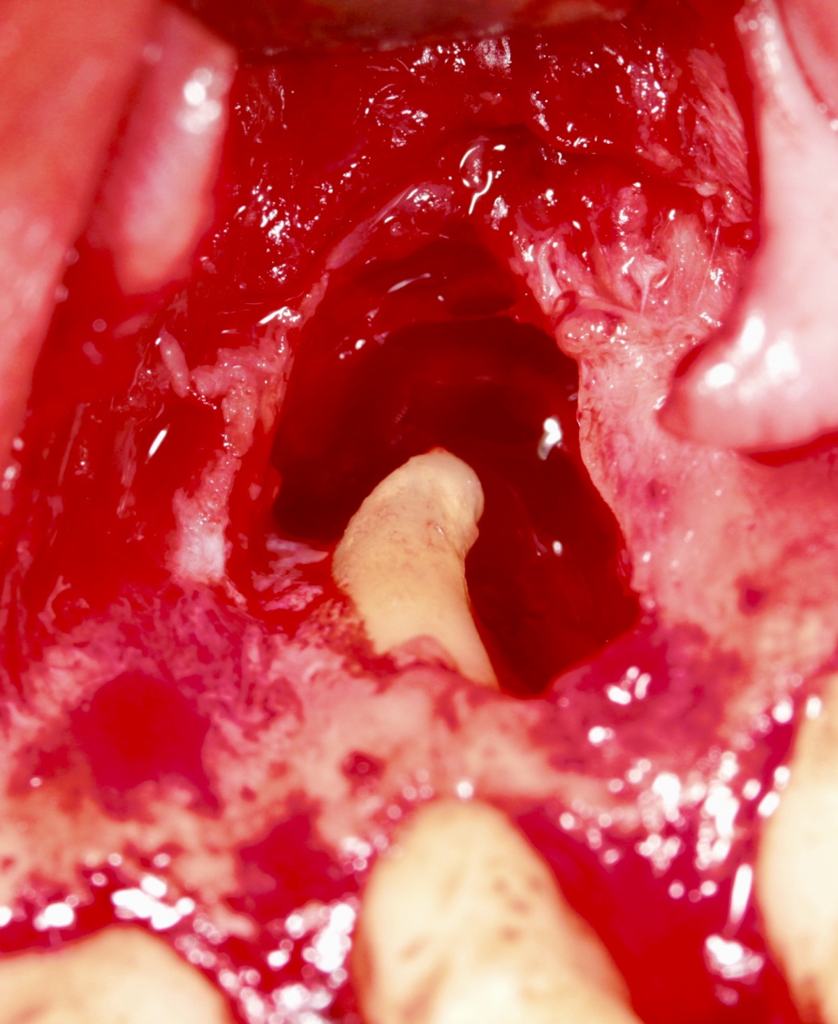 Nach Wurzelfüllung des Zahnes 22, erfolgte die intrasulkuläre Schnittführung mit Entlastungenschnitten mesial der Zähne 21 und 24, um einen ausreichenden Abstand der Schnittränder zum Defekt zu gewährleisten. Bereits während der Lappenbildung imponierte ein umfangreicher Defekt des vestibulären Knochens in Höhe der Wurzelspitze des Zahnes 22. Die Osteolyse dehnte sich bis zu den Wurzeln der Zähne 21 und 23 aus und durchbrach zudem die palatinale und nasale knöcherne Begrenzung. Nach Entfernung des Granulationsgewebes deckten wir den Defekt mit einer resorbierbaren Kollagenmembran (Creos Xenoprotect der Firma Nobel Biocare AB, Göteborg) ab und vernähten den Mukoperiostlappen spannungsfrei.