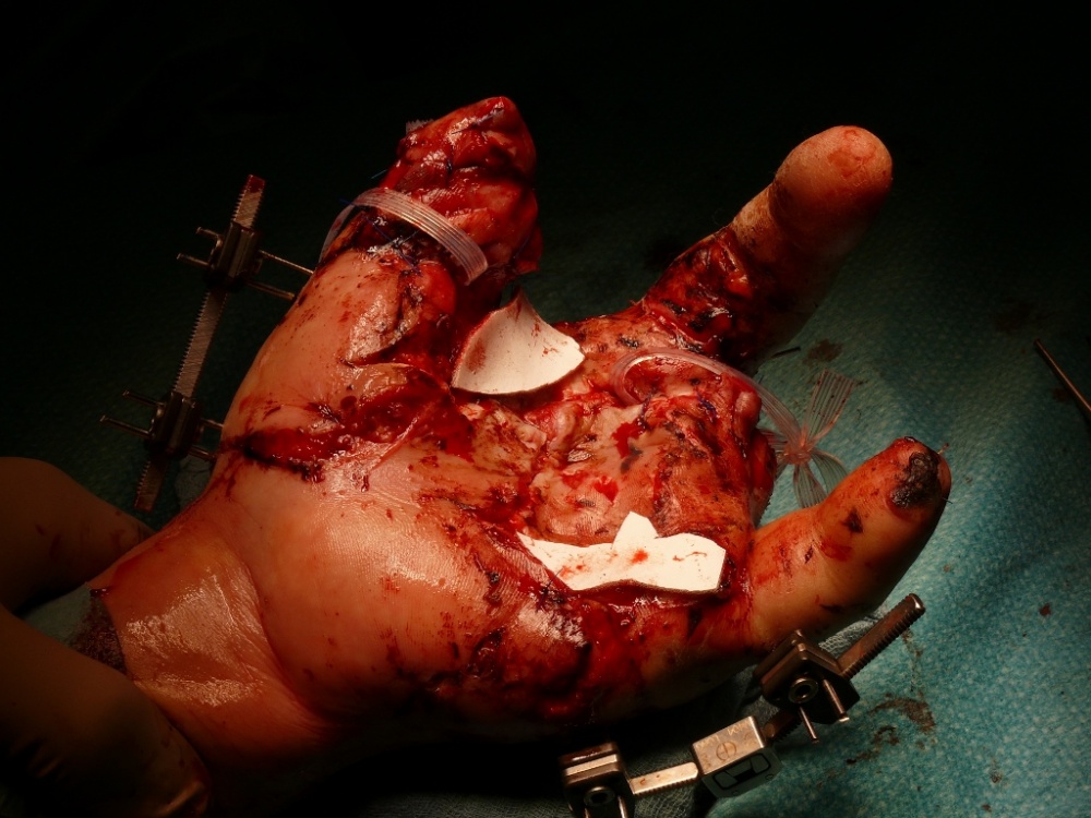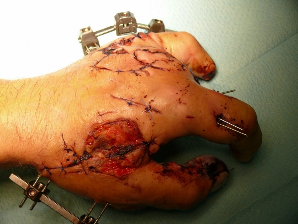 Abb. 2: Nach Primärversorgung mit bebridement; Weichteildeckung und Stabilisierung mittels Fixateur externe; Ansicht von plamar