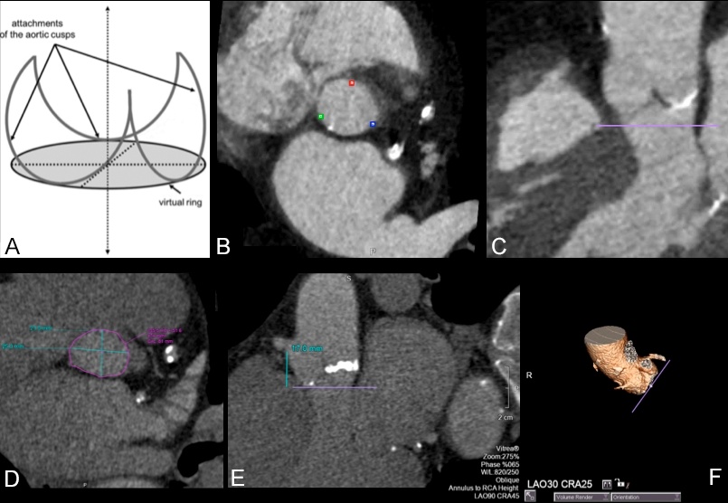 2012) abgeleitet wird. Je nach Individuum und abhängig von der Herzzyklusphase (B, C, D) weist diese Ebene in vivo eine runde bis ovale Form auf. Zur sicheren und korrekten Implantation müssen die Distanzen zwischen dieser Ebene und den Koronararterien orthogonal gemessen werden (E). Eine dreidimensionale Rekonstruktion ermöglicht die Orientierung im Raum und liefert hilfreiche Angulationswerte, die für die Implantatausrichtung benötigt werden (F).