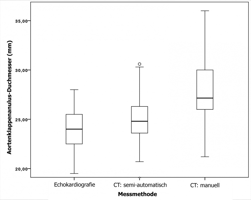 In den untersuchten Messmethoden zeigten sich differierende Ergebnisse bzgl. des mittleren Aortenklappenanulusdiameters (Abb. 3). In der Echokardiographie wurden die kleinsten Diameter ermittelt (24,05 ± 2,27 mm). Die CT-basierte, semi-automatisch retrospektiv gemessenen Diameter waren geringfügig größer (25,03 ± 2,79 mm). Größere Diameter für die Aortenklappenanulusebene (28,53 ± 4,64 mm) wurden mit der manuellen CT-Messung bestimmt.