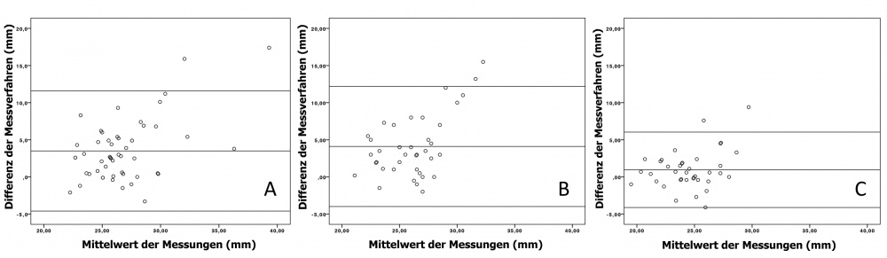 Unterschiede zwischen der semi-automatischen und manuellen Messung der CTScans werden im linken Diagramm (A) deutlich. Der mittlere Plot (B) zeigt die Differenzen der Echokardiographie und des manuellen CT-Messverfahrens. Unterschiede zwischen Echokardiographie und semi-automatischer Messmethode sind rechts dargestellt (C). Auffällig sind die großen Messdifferenzen der CTMessmethoden untereinander (A) und des manuellen CT-Messverfahrens gegenüber der Echokardiographie (B). Demgegenüber unterscheiden sich die echokardiographischen von den semi-automatischen Messungen nur geringfügig (C).