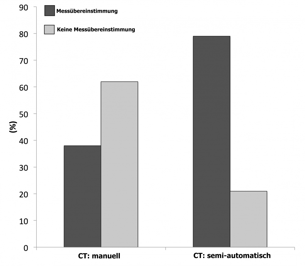 Nur in wenigen Fällen, in denen die Bildqualität suboptimal oder die Kontrastphase nicht optimal war, war es nötig die automatische Messung manuell zu korrigieren. Dies deckt sich mit den kürzlich von LOU et al. veröffentlichten Ergebnissen [20]. Insgesamt ergibt sich hieraus die Frage, ob neue Softwarelösungen und modernere Scannersysteme mit schnelleren Akquisitionszeiten und iterativer Rekonstruktion noch verlässlichere Resultate generieren könnten.