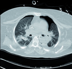 Führende Symptome sind: Dyspnoe, Hypoxie und Hyperkapnie – passend zu dem Schädigungssetting – und charakteristische Veränderungen in der Bildgebung (Röntgenaufnahme des Thorax und CT, siehe Abbildung 2). Historisch wird die Entwicklung einer klinischen Apparenz innerhalb von 24 bis 72 h beschrieben [10], jedoch konnte Pizov [14] bei der Mehrzahl seiner Patienten bereits unmittelbar nach dem Trauma eine klinische Symptomatik beschreiben. Eigene Erfahrungen zeigen, dass ein Beobachtungszeitraum von bis zu 48 h, bei entsprechender Traumagenese, bis zum Auftreten erster charakteristischer Symptome erforderlich sein kann. Als Prädilektionsstellen werden von Horrocks [7] die medialen, costophrenischen und subpleuralen Lungenanteile beschrieben.