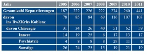 In den untersuchten Jahren wurden 1 610 Soldaten wegen Krankheit, Verletzungen und Verwundungen nach Deutschland repatriiert (Tabelle 1). Bei 641 Soldaten erfolgte die weiterführende Therapie im BwZKrhs Koblenz. 31 dieser repatriierten Soldaten waren auf Grund einer Explosionsverletzung intensiv-pflichtig, 25 hatten eine Explosionsverletzung der Lunge.