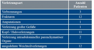 Die Verwundeten waren zum Zeitpunkt des Intensivaufenthaltes zwischen 22 und 56 Jahre alt. Es wurden 24 männliche Soldaten und ein weiblicher Soldat auf der Intensivstation behandelt. An relevanten Vorerkrankungen war nichts bekannt. Die Patienten wurden zwischen 2 und 57 Tagen (Median: 12 Tage) stationär behandelt. Die Beatmungsdauer lag zwischen 12 h und 1 368 h (Median: 144 h); sie betrug bei 10 % weniger als 45 h, bei 80 % zwischen 45 und 384 h und lag bei 10 % über 384 h. Ein Patient wurde über 1 368 h beatmet.