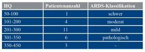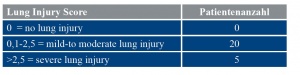 Den für ein BLI pathognomonisch veränderten, kalkulierten Horovitz Quotient (HQ) von arteriellem Sauerstoffpartialdruck (paO2) und inspiratorischem Sauerstoffanteil (FiO2) zeigt Tabelle 3. Bei Aufnahme zeigten 22 Patienten pathologische HQ-Werte. Nach der Berlin Definition des Acute Respiratory Distress Syndrome (ARDS) [14] waren ein Soldat von einem schweren, vier von einem moderaten und elf Soldaten von einem milden ARDS betroffen, neun zeigten nach dieser Definition keine Zeichen eines ARDS. Diese Tendenz zeigte sich auch in der Ermittlung des Lung Injury Score nach Murray (Tabelle 4) [13].