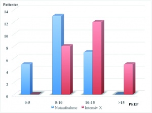 Bei sechs Patienten wurde der PEEP nach Aufnahme im Mittel um 5 mbar erhöht (Abbildung 3). Der durchschnittliche PEEP betrug 12 mbar (5 – 20 mbar).