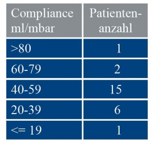 Die Compliance als Maß für die Elastizität des Respirationstraktes zeigte bei sieben Patienten deutlich pathologische Werte -(Tabelle 5). Diese Werte sind mit den Compliancewerten beim akuten Lungenversagen (ARDS) vergleichbar. Der Großteil der Patienten war mit seiner Compliance zwar im subnormalen Bereich, jedoch innerhalb der auch im Rahmen von Allgemeinanästhesien zu erwartenden Werte [13].