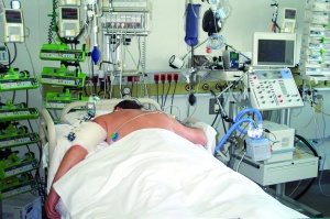 Zum Thema Beatmungstherapie des BLI gibt es zwar zahlreiche Veröffentlichungen [2, 3, 4, 14], jedoch kein standardisiertes Vorgehen. Insbesondere die Applikation von hohen PEEP Werten wird teilweise sehr kontrovers diskutiert. Die Sorge, dass es durch die Applikation endexspiratorisch höherer Drücke zu Luftembolien kommt, führte in früheren Veröffentlichungen [1] zur Forderung, auf diese zu verzichten oder sie zu minimieren. Die Erfahrung mit unserer Patientenklientel und auch die umfangreichen Daten der israelischen Arbeitsgruppen um Pizov [14] und Avidan [3] zeigen jedoch, dass ein lungenprotektives Beatmungsmuster mit ausreichend hohem, individuell titriertem PEEP (Best PEEP mit höchstem PaO2 bei niedrigstem PaCO2) nicht nur therapeutisch sinnvoll, sondern auch sicher durchführbar ist. Eine Luftembolie konnte bei keinem unserer Patienten detektiert werden. Sollten die pathophysiologischen Kriterien einer lungenprotektiven Ventilation allein nicht erfüllbar sein, so stehen uns Spezialverfahren, wie die Extracorporale Membran Oxygenierung (ECMO) und eine Beatmung mit NO zur Verfügung. In unserem Patientengut musste lediglich ein Patient einer NO-Beatmung unterzogen werden [4]. Die frühzeitige kinetische Therapie mit Bauchlagerung oder 130°-Lagerung (Abbildung 4) gehört ebenfalls zum Standardrepertoire in der Behandlung des BLI.