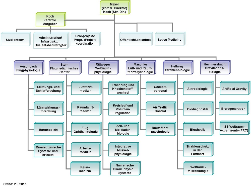Das Institut für Luft- und Raumfahrtmedizin des DLR in Köln-Porz besteht aus insgesamt sechs Abteilungen, davon ist die Abteilung für Luft- und Raumfahrtpsychologie in Hamburg disloziert. Einzigartig ist die neue Forschungsanlage :envihab am Standort Köln. Innerhalb des gesamten DLR e. V. ist das Institut für Luft- und Raumfahrtmedizin die einzige Forschungseinrichtung, die sich mit den lebenswissenschaftlichen Fragestellungen im Hinblick auf die Luft- und Raumfahrt sowie den Verkehr befasst.