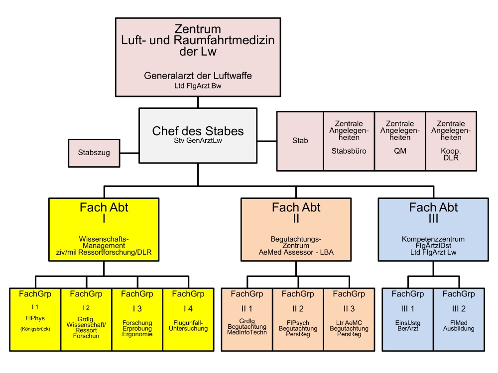 In der Fachabteilung (FA) I sind die ehemaligen Abteilungen II, III, IV und V, mit Ausnahme der lehrgangsgebundenen Ausbildung am Standort Fürstenfeldbruck, integriert worden. Zusätzlich wurden die Aufgaben für die Grundsatzfragen der Wissenschaft (ehemals Dienststelle Generalarzt der Luftwaffe) mit in die FA I integriert. Die Fachgruppe 1 in Königsbrück ist das Flugphysiologische Trainingszentrum, die Fachgruppe 2 in Köln befasst sich mit Grundsatzfragen der Wissenschaft, in der Fachgruppe 3 sind die ehemaligen Abteilungen IV in Manching und der Anteil der Forschung und Wissenschaft der ehemaligen Abteilung III in Fürstenfeldbruck aufgegangen. Die Fachgruppe 4 befasst sich mit Fragestellungen der Rechtsmedizin und Flugunfalluntersuchung. Die FA II ist das Begutachtungszentrum, das mit seinen drei Fachgruppen die flugmedizinische und psychologische Begutachtung sowie die psychologische Eignungsfeststellung sicherstellt. Die FA III wird durch den leitenden Fliegerarzt der Luftwaffe geführt. In der FA III wird die fliegerärztliche Tätigkeit fachlich koordiniert und weiterentwickelt. Darüber werden operative Fragestellungen der Materialversorgung und der Aus- Fort- und Weiterbildung in der FA III federführend bearbeitet.
