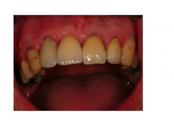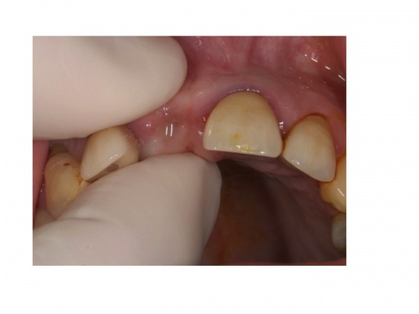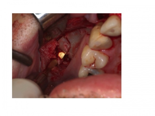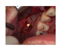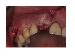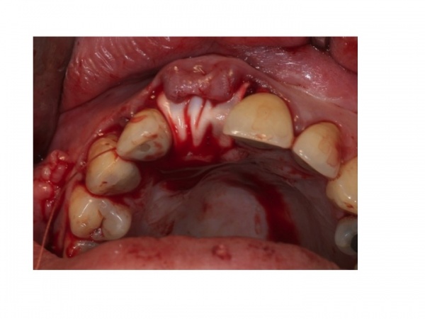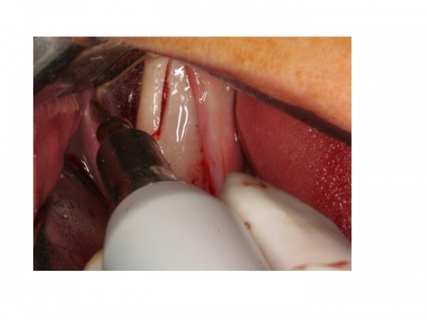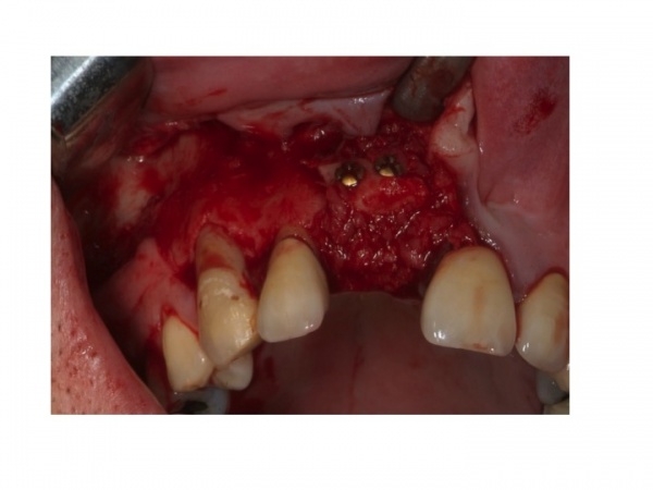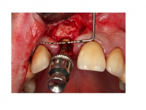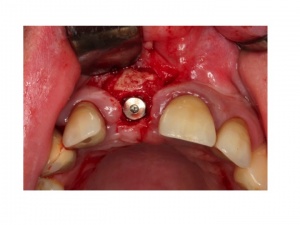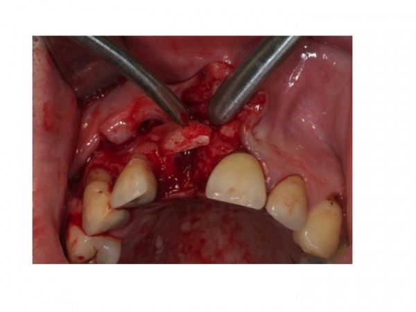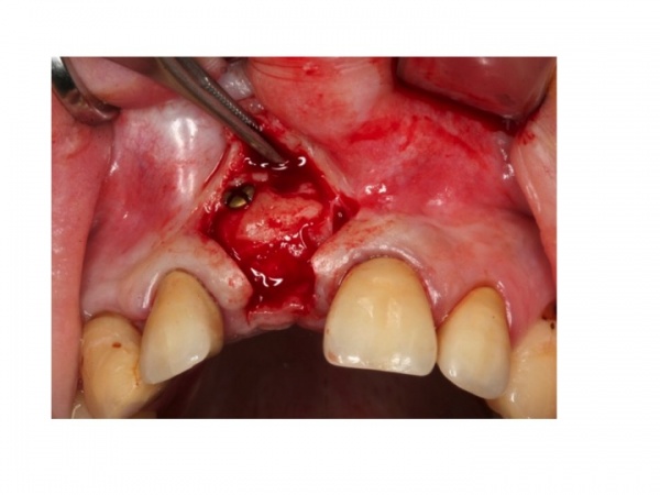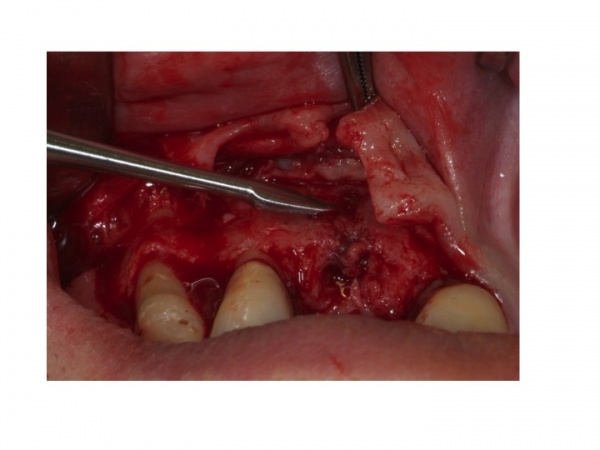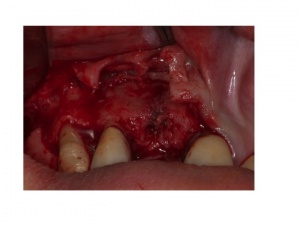 Bei dem Patienten ging der Zahn 11 nach frustraner endodontischen Behandlung verloren. Der Wunsch des Patienten bestand in einer implantologischen Versorgung, so dass nach einer Heilphase post extraktionem von drei Monaten die implantologische Versorgung geplant wurde. Im ersten Schritt stand die Wiederherstellung der äußeren Kontur an, auch wenn der intraorale Eindruck dieses weniger vermuten lässt (Abb. 5). Dazu musste durch eine Augmentation der durch die apikale Osteolyse verlorengegangene Knochen wieder aufgebaut werden. Auf die Verwendung von Knochenersatzmaterialien wurde verzichtet, so dass die Augmentation mit partikulärem Knochen unter zu Hilfenahme eines Knochenstückes von der christa erfolgte. Nach Präparation eines Mukoperiostlappens erfolgte die Inspektion des Alveolarfortsatzes. Dabei zeigte sich, dass die bukkale Lamelle nicht intakt war und noch reichlich Granulationsgewebe vor Ort war (Abb. 6). Dieses musste ausführlich kürettiert werden, damit sich zwischen dem Augmentat nicht neues Granulationsgewebe bildet und die Osseointegration verhindert wird und damit das Ausmaß der Augmentation überblickt werden konnte (Abb. 7).