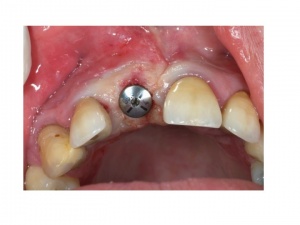 Nach einer Einheilzeit von drei Monaten konnte schließlich nach Entfernung der Osteosyntheseschrauben (Abb. 14) eine Osseointegration des Transplantates festgestellt und ein dentales Implantat inseriert werden (Abb. 15, 16 & 17). Nach weiteren drei Monaten erfolgte die Freilegung mit Ausformung der Gingiva (Abb. 18). Das endgültige prothetische Ergebnis zeigt sich dann nach Eingliederung der Krone (Abb. 19).