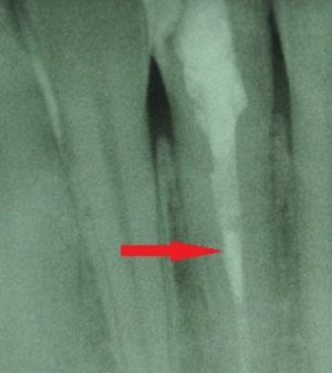 Nach Spülung mit Natriumhypochlorid konnte die Blutstillung in unter zwei Minuten gewährleistet werden. Ich platzierte eine Schicht hydraulischen Kalziumsilikatzement (Mineral Trioxide Aggregate (MTA)) auf der Pulpa und deckte die Wunde mit Unterfüllung und einem Kompositaufbau ab.