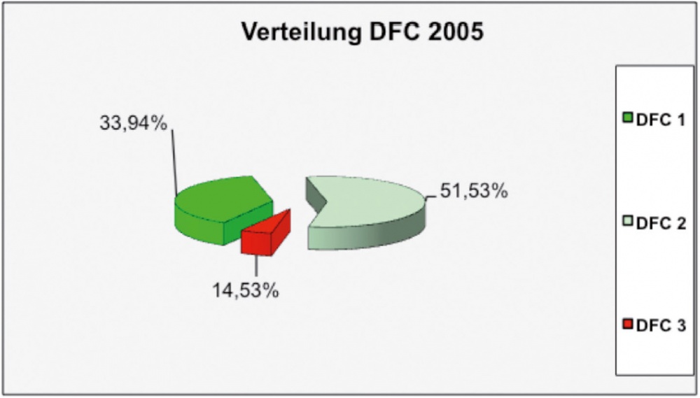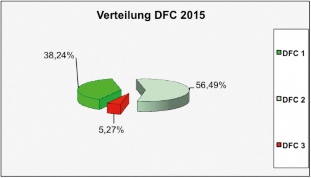 Die Vergabe der DFC erfolgt jährlich, d. h. einmal im Jahr muss eine zahnärztliche Untersuchung durchgeführt werden. Uneingeschränkt einsatzverwendungsfähig sind nur Soldaten der Fitness-Klassen 1 und 2. Soldaten mit einer DFC 3 müssen priorisiert eine Behandlung erfahren, um zumindest in die DFC 2 zu gelangen. Dass die Einführung der Dental-Fitness-Classification zu einer signifikanten Verbesserung der Zahngesundheit geführt hat, vermögen die Abbildungen 4 und 5 zu veranschaulichen. Dabei handelt es sich um Daten, die in den Auslandseinsätzen bei den dort vorgestellten Soldaten vergeben wurden. Mussten im Jahre 2005 noch 14,53 % der Soldaten mit einer DFC 3 beurteilt werden, so waren es zehn Jahre später „nur“ noch 5,27 %.