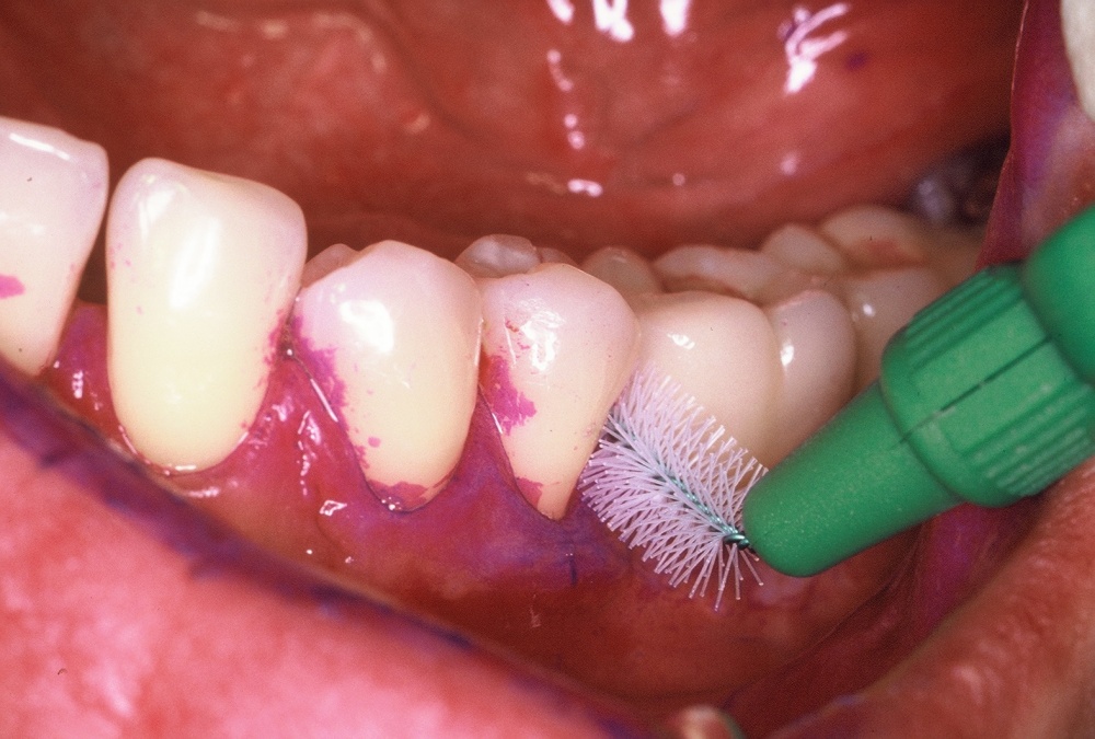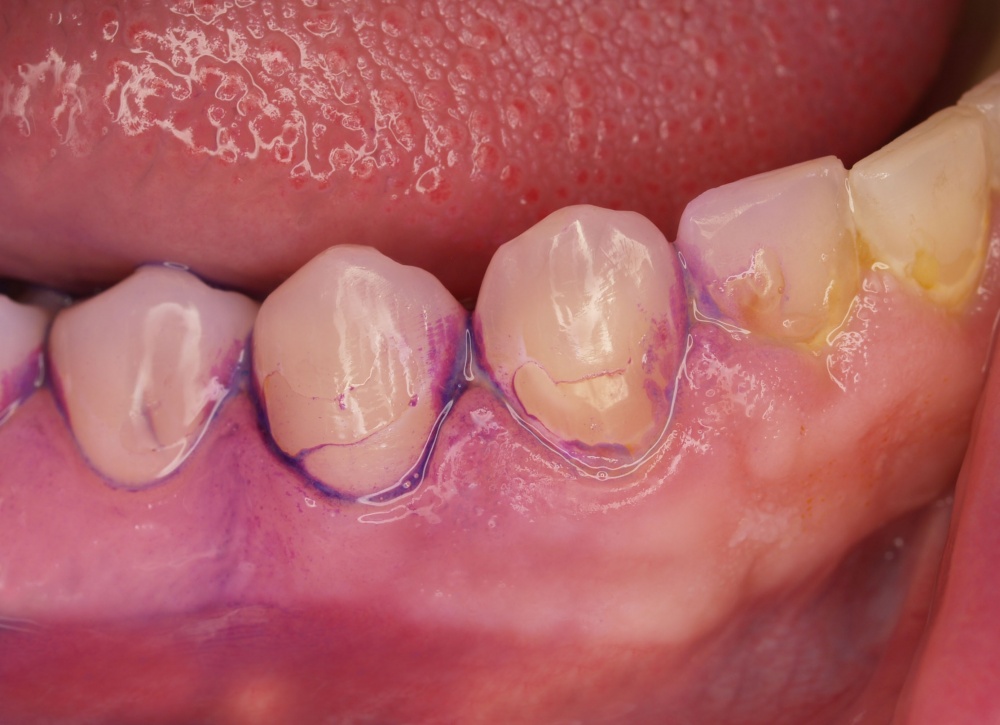•IP1 – Mundhygienestatus: Darunter versteht man die Beurteilung der Mundhygiene mittels Anfärben der bakteriellen Beläge und der Benutzung eines geeigneten Index, z. B. des Approximalraumplaqueindex (Abb. 6). Für die Beurteilung des Gingivazustandes ist ebenfalls ein geeigneter Index anzuwenden, z. B. der Sulkusblutungsindex.